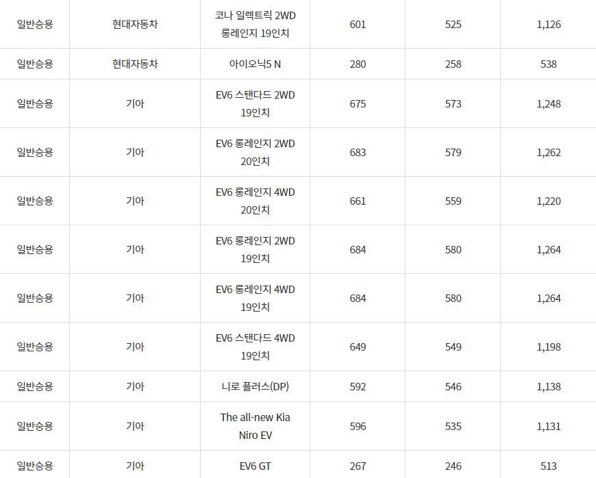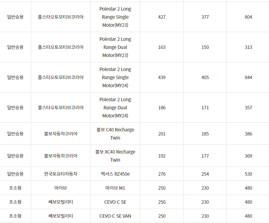2024년 경주시 전기차 차종별 보조금 (국비+지방비)