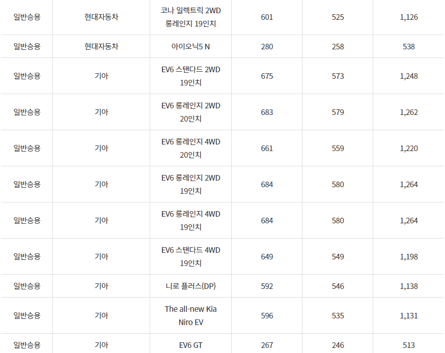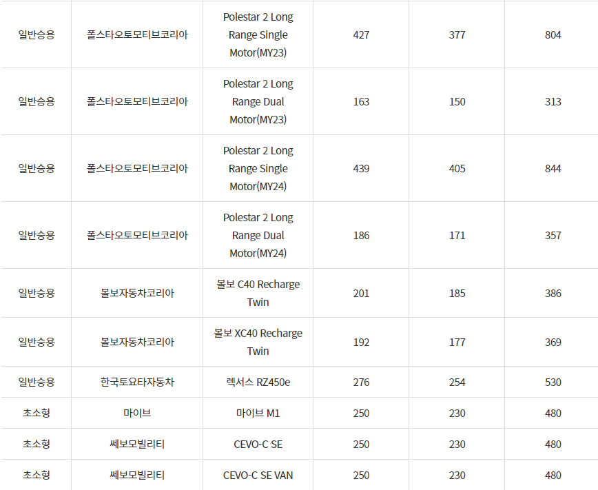 2024년 상주시 전기차 차종별 보조금 (국비+지방비)