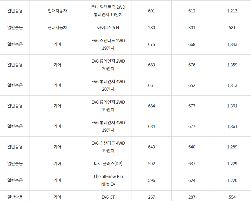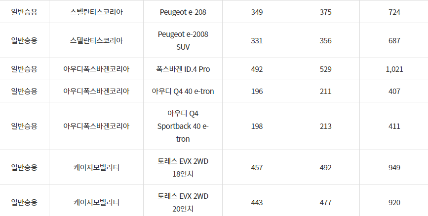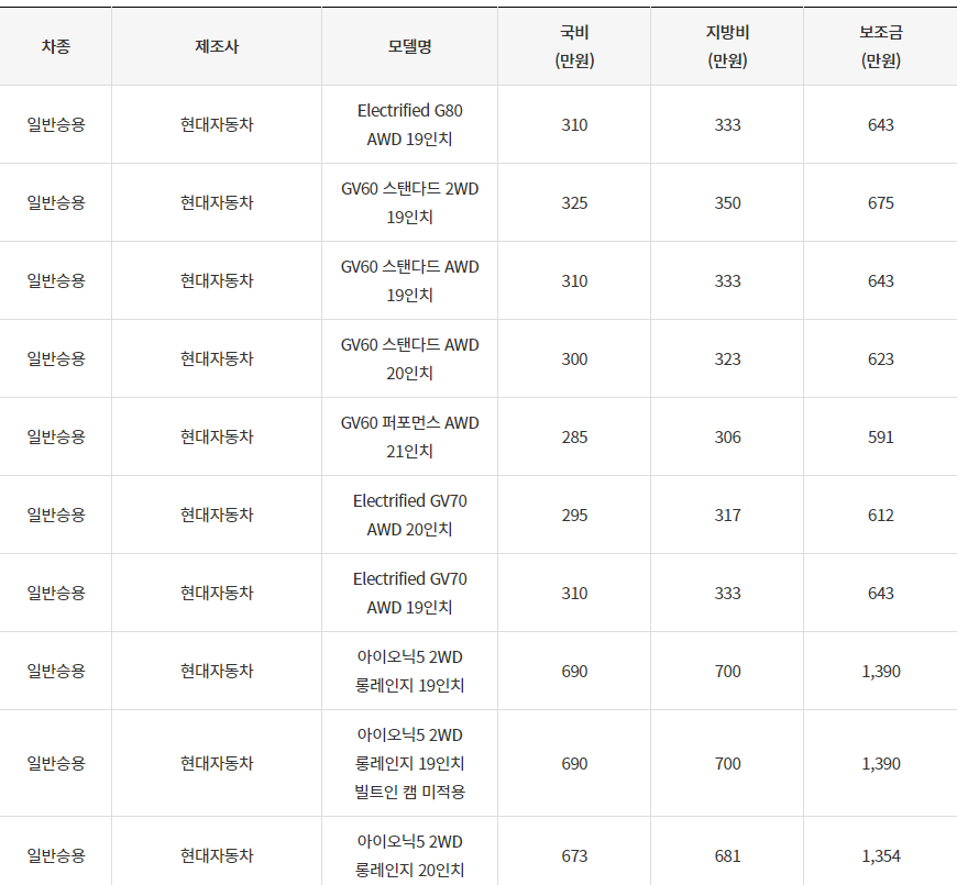 2024년 순창군 전기차 차종별 보조금 (국비+지방비)