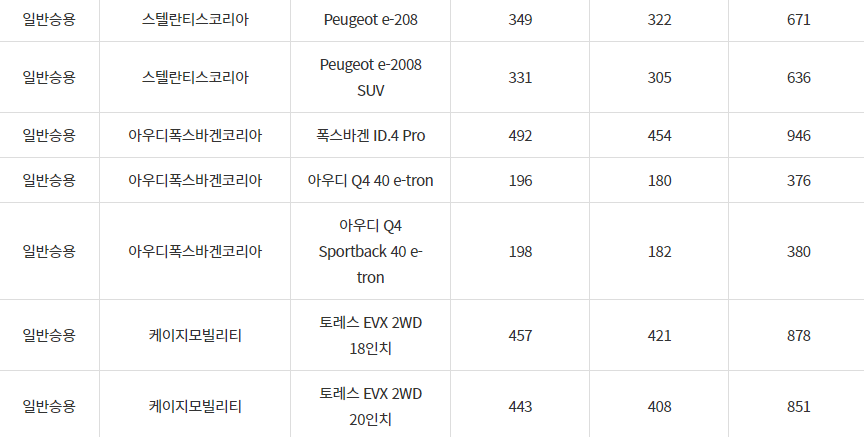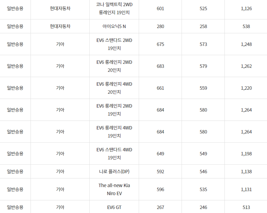 전기차 보조금입니다. 차종별로 국비 지원과 지방비 지원금 내역입니다.