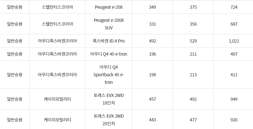 2024년 전주시 전기차 차종별 보조금 (국비+지방비)